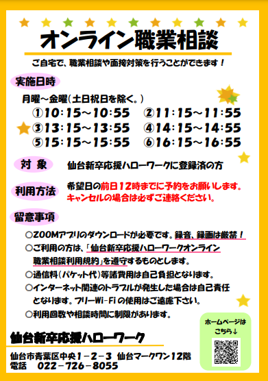 【在学生の皆さんへ】新卒応援ハローワークにおけるオンライン職業相談(模擬面接)について(1/17-3/31)