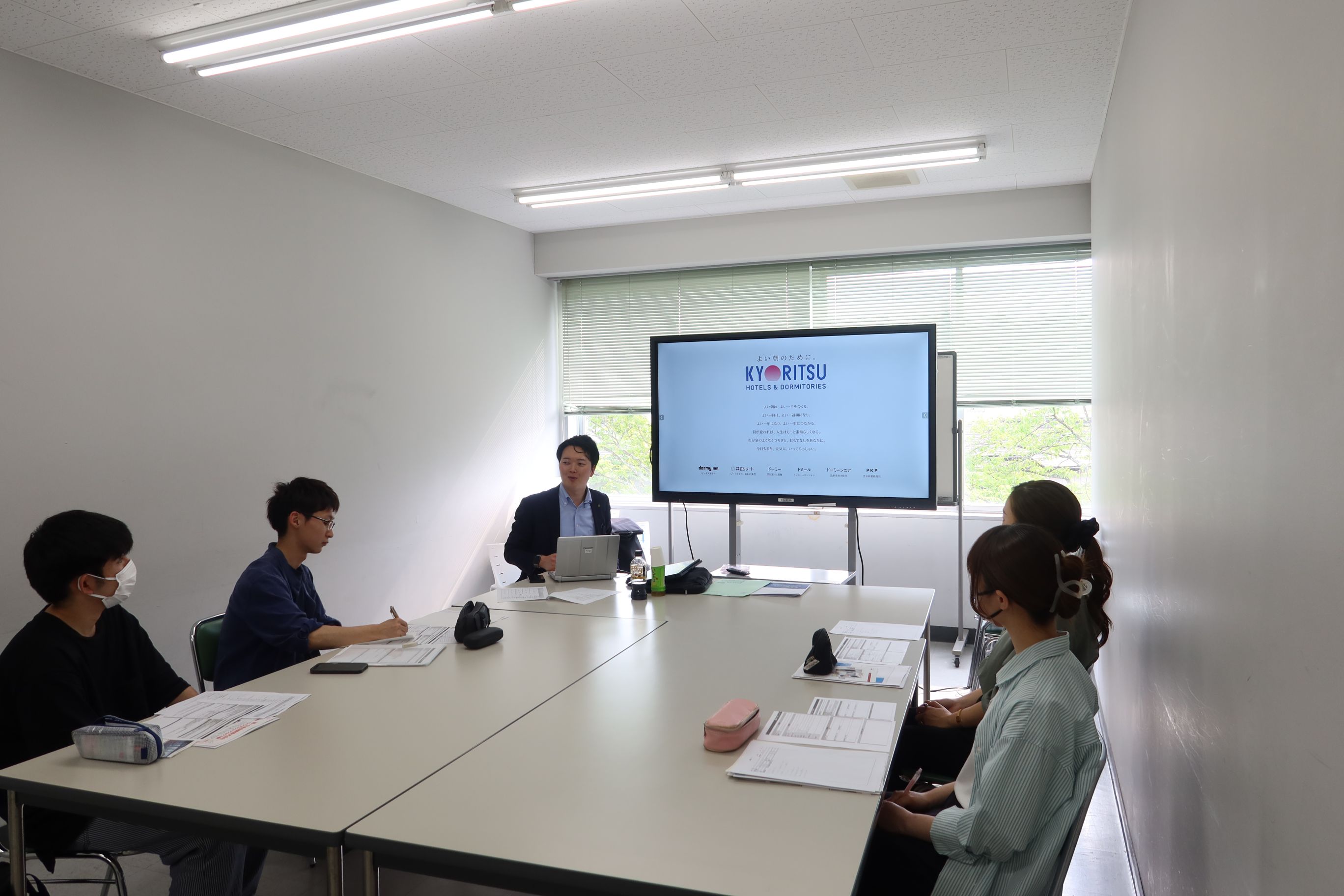 6月12日には、その事前研修の一環として、学生が様々な業界におけるビジネスの動向や働き方を知り、社会に対する視野を広げることを目的とする「企業インタビュー」を実施しました。全5グループに班分けされた学生は事前に企業研究を行い、当日の役割分担から取材内容まで打ち合わせを行いインタビューに臨みました。当日は、本学にお越し頂いた各企業の方から、各社の事業内容や?将来展望、求める人物像など、幅広いテーマについてお伺いしました。学生達は初めは緊張の面持ちで準備した質問を聞いていましたが、少しずつ慣れてくると話を聞く中で興味を持った事柄を質問する様子も見られました。