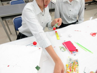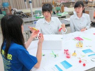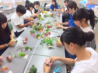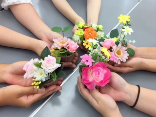 体験授業は、造花を使ってフラワーアレンジメントを行いました。参加者と在校生がお話ししながら作りました。インスタ映えの写真も撮りました?参加した皆さん、ありがとう?