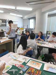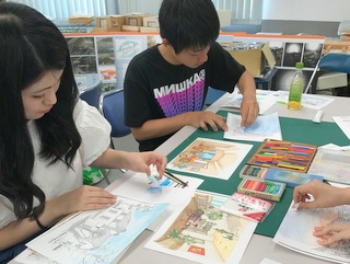 インテリアコーディネーターの仕事と万博体育平台_天下足球网¥皇冠app官网や実習、校外学習やショールームの見学会の様子について説明。午後のワークショップでは、パステルやマーカーなどの画材を使ってパース(完成予想図)の着彩に挑戦しました。皆さん、うま~い!!