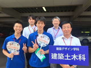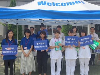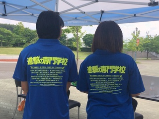 専門学校の支援学生の皆さんは、“進撃の専門学校”のお揃いのポロシャツを着てお出迎え。夏の太陽に負けないで頑張るぞー!