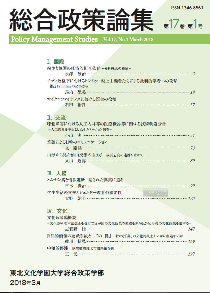 そのような文脈において,国際政治経済学(IPE)の枠組みから国際情勢の背後に潜む経済構造を読み解く新たな視点を提起した永澤先生の論文「紛争と協調の経済的相互依存-分析概念の検証-」や,国際基督教大学(ICU)卒業後にインドでの調査研究に従事した馬内先生のライフワークの一環ともいえる「モディ政権下におけるヒンドゥー至上主義者たちによる批判的学者への攻撃-雑誌Frontline の記事から-」と同様に,石田先生の論文は総合政策学的視点からの国際問題への接近(approach) を示唆するものである,と私たちは考えました.