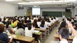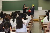 学生が実際に講義を受けている教室で、学生と一緒に講義を受けていただきました。