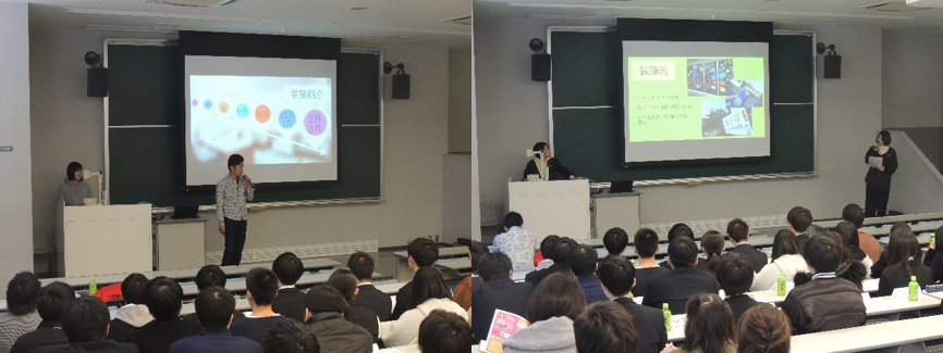 在校生からのメッセージとして、大学の1年間のスケジュールに沿った形で学部紹介が行われ、学園祭の様子、新入生学外研修の様子、助成金を活用した海外活動の様子を入学予定者に伝えました。これらの話を通して、大学の多くのイベントでは、学生が主体となって活動しており、その中にやりがいや楽しさがあることが、伝わったのではないかと思います。