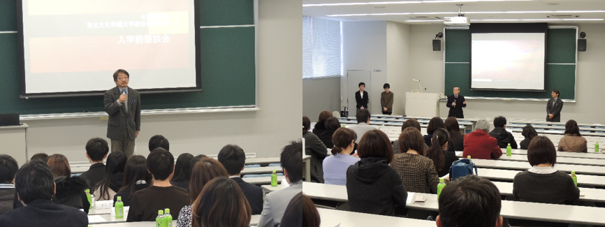 当日は、岡惠介学部長の挨拶から始まり、在校生からのメッセージ、入学予定者及び教員の自己紹介が行われ、その後、入学予定者は在校生とのフリートーク、保護者は保護者懇談会という流れで行われました。