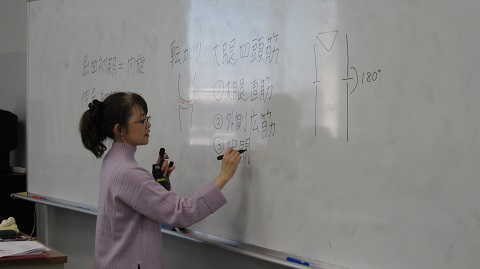 この授業は1年生前期に「解剖学演習」で学んだ全身の骨や筋が、どのように作用して運動を行っているのかを学ぶ授業です。