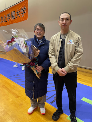 会長就任お祝いの花束贈呈をフェンシング部齋藤有監督が行いました。