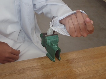 (右手が病気で動かしにくいときに、左手の袖のボタンをとめる、はずす自助具)