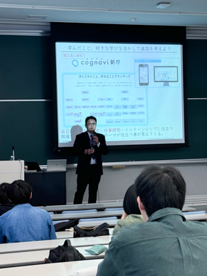 講師として株式会社フォーラムエンジニアリング 大学支援推進部の秋山広太郎氏を招き、エンジニアやメーカーを目指すための学びの活かし方や自分の強みと職種のマッチングについて講演が行われました。