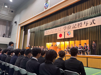 後半は各学科別の授与式となり、知能情報システム学科では卒業生一人ひとりに学位記が手渡されました。学科長は卒業生に向けて、老子の言葉「千里の道も一歩より」を贈り、新たな旅立ちを祝福しました。