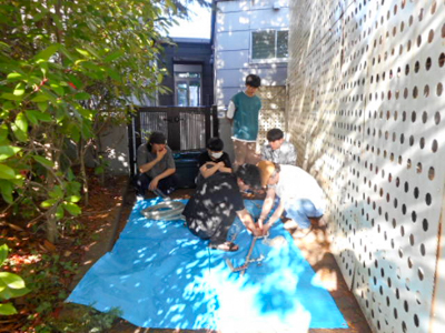 位置づけが理解できたところで、まず給水吐水ユニットの組み立てからスタート。建築設備コースの3?4年生が2チームに分かれて作業を行いましたが、工具を使うのが初めての学生もおり、給排水設備の仕組みの実践的学習にもなりました。