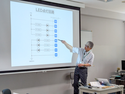 神村准教授による模擬授業「はじめてのマイコン電子工作入門」の様子