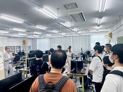 鈴木伸夫教授によるネットワーク演習室の説明を熱心に聞く高校生たち