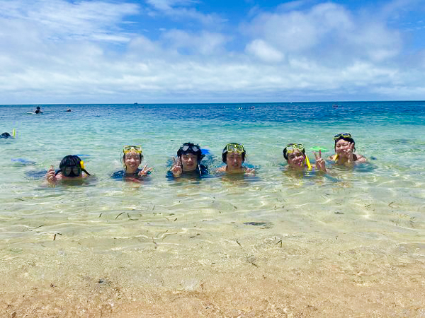 学生たちは到着後すぐにスノーケリング用のゴーグルとフィンを借りて海で泳いでいました。