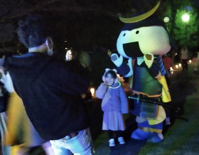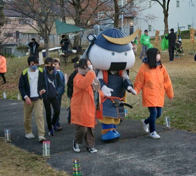 当日は天候にも恵まれ、多くの地域住民の方々が来場されました。学生達は、行事開始の16時30分に合わせて会場一帯に設置されたペットボトルランタンへの点灯作業や管理、会場へ赴いた参加者の誘導?整理を行うほか、今回のサプライズ企画「仙台?宮城観光PRキャラクター “むすび丸”と触れ合う」で来場した“むすび丸”の介添え役として縦横無尽に活躍しました。