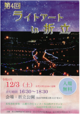 “ライトアートin折立”とは、仙台市西部折立地区の住民?事業所の有志が中心となって“折立素敵物語実行委員会”を結成、地区の小中学校、幼稚園、保育所等を巻き込んで地域コミュニティの醸成を目途に始めた事業です。