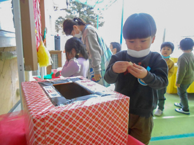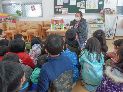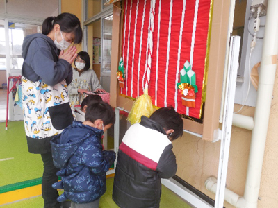 各クラスでは、ペープサートを用いて十二支の話を聞き、干支に興味を持ちました。今年一年も、どうぞよろしくお願いします。