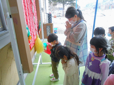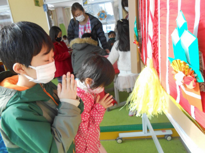 お参りでは、真剣に手を合わせている子が多く、クラスに戻ってから何を拝んだのか聞くと、「○○○がほしいです」というお願いが多かったです。