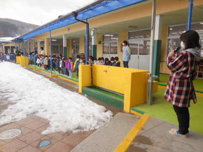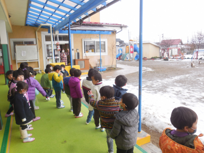 しっかりと防寒し、全園児でテラスに集まりました。ソーシャルディスタンスを保って、マスクを着用し、コロナ対策は万全です。