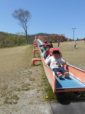 まずは、ロングすべり台。すべりが悪いので、うでの力を使って進みます。