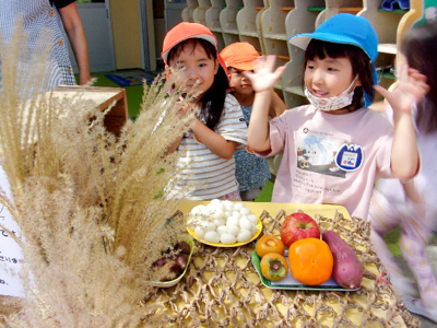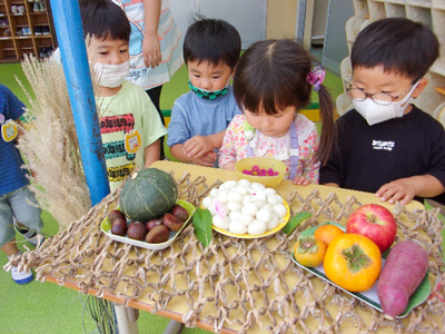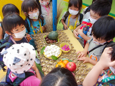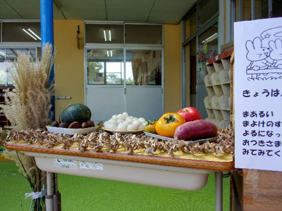 魔除けのすすきと、今が旬の果物や、いも?くり?かぼちゃと一緒にお空に向かってお供えしました。