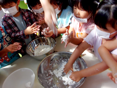 テラスにテーブルを出し、「おだんごをつくるよ~」と声を掛けると、好奇心旺盛な子どもたちが大勢集まってきました。