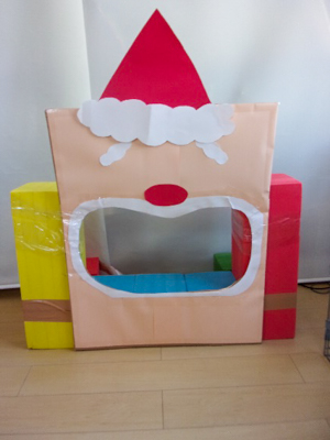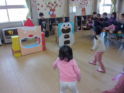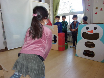 はらぺこサンタさんと雪だるまの口にキャンディー(ボール)をポイ!!入ったらプレゼントがあると伝えるとみんな真剣な表情に変わりました。