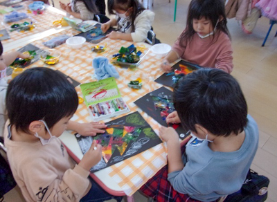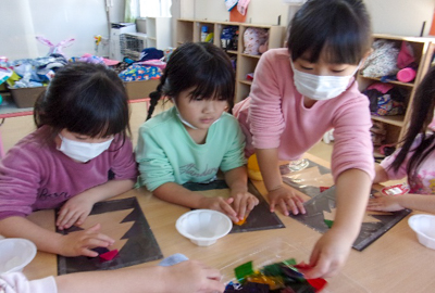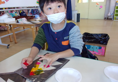 1枚1枚丁寧に並べて貼る子や豪快に2~3枚重ねて貼る子など個性豊かな作品が出来上がりました。