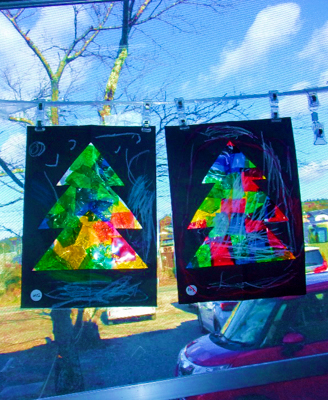 お楽しみの活動1つ目はクリスマス製作!キラキラきれいなステンドグラスを作りました。
