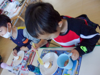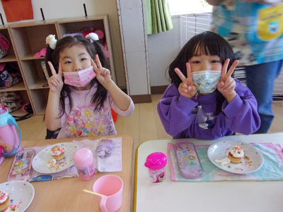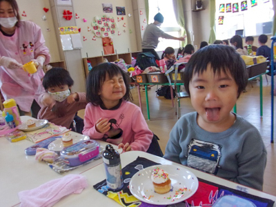 マフィンに乗りきらない量の生クリームをトッピングする子や生クリームが苦手でチョコスプレーのみトッピングする子、マフィンの味を楽しむためあえて何もトッピングしない子など思い思いのケーキを作り昼食時に口いっぱいに頬張って美味しそうに食べていました。