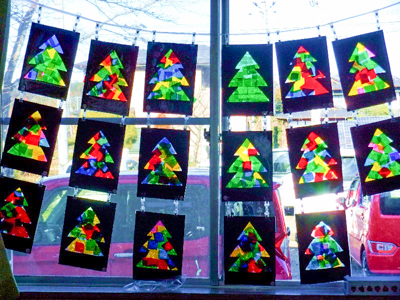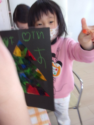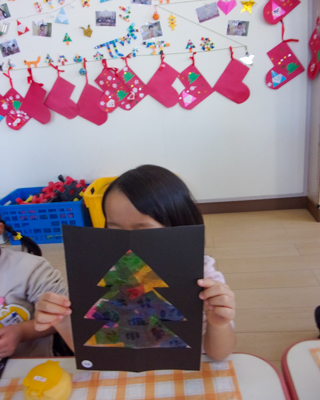 年少さんはカラーセロファンを貼りクレヨンで好きな絵を描き、年長?年中さんは画用紙をツリーの形に切り抜くことにも挑戦しました。