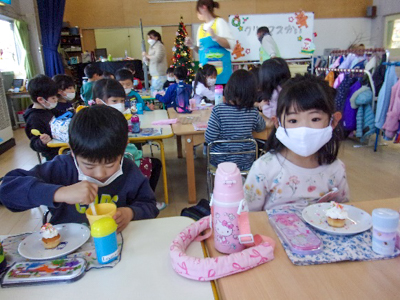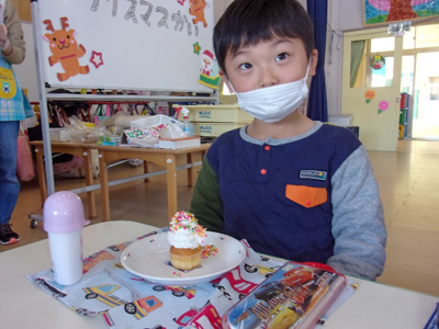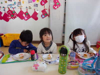 今年の預かりクリスマスケーキはプチマフィンに生クリームとチョコスプレーをトッピングし昼食時にデザートとして食べました。