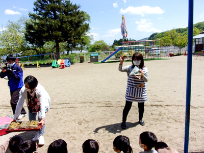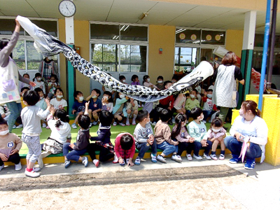 行事の由来や、新聞紙カブトの折り方を知り、「作ってみたい!」「カッコイイ!」と目を丸くしていました。各クラスの代表が、こいのぼり作品を紹介してくれました。年少さんもドキドキしながら立派に自己紹介ができましたよ!こいのぼりの歌が始まった時???なんと、大きなこいのぼり達が登場して子どもたちは大喜び!実際に触って満足そうな表情を見せてくれました。