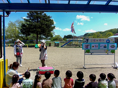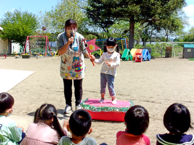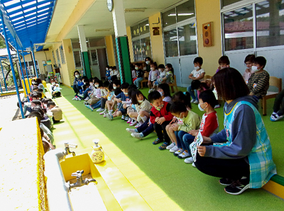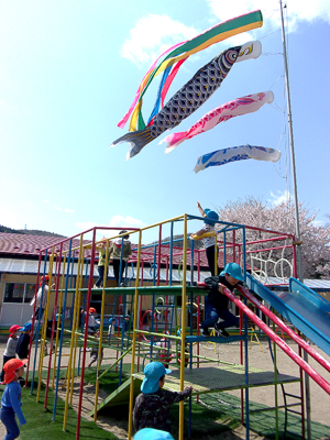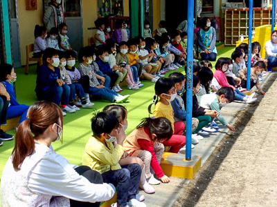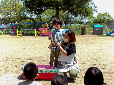 子どもたちの健康と健やかな成長を願い、こどもの日を祝う会を行いました。温かな風が心地よいテラスに集まり、空高く泳ぐこいのぼりを眺めながら、祝う会がスタート!