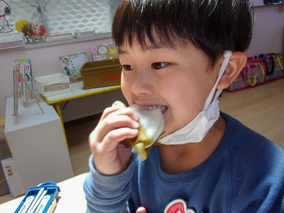 最後に、金のカブトを被った園長先生が「元気モリモリになってね!」と沢山の柏餅を届けてくれました。楽しくて美味しい一日となりました。すくすく大きくな~れ!