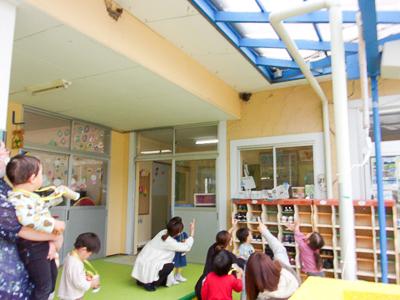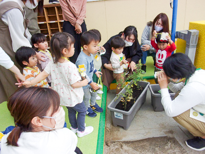 後半はカラフル双眼鏡を持って、園内探険にレッツゴー!友愛キッズ達は可愛いお客さんが来てくれたことが嬉しくて、いつも以上に張り切って歌を披露していました。クラスの様子を見学しつつ、飼育中のザリガニちゃん、まだ小さくて緑色のトマトちゃんなど、様々な物を双眼鏡で観察し、たくさんの発見にワクワク。ツバメがピューン!と飛んできて、雛にエサを届ける瞬間は、皆ビックリ!大きな口を開ける雛たちに会えましたね。園庭でも元気いっぱい遊び、あっという間の1時間半でした。