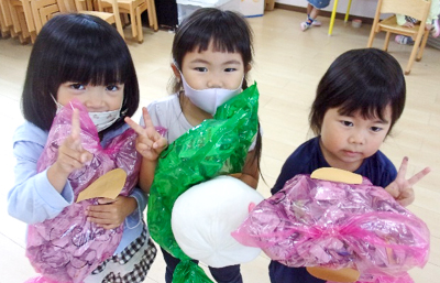 ポリ袋にちぎった新聞紙を入れて体を作りました!