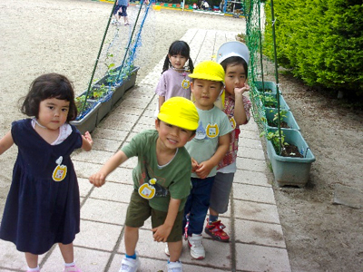 お友達と笑い声を響かせながらだんだん鬼に近づいてくるなのはな組の子どもたち?