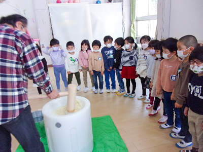 子ども達が楽しみにしていたもちつき会。今年は、感染対策を徹底し、子ども達がついた餅も美味しくいただきました。味はきなこ、みたらし、雑煮の三種盛り。つきたての餅は格別でした!もうすぐお正月。桜組がついた餅を分けてもらい、鏡もちにして玄関に飾りました。来年も皆が元気に過ごせますように。