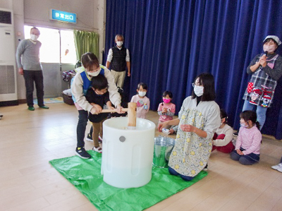 「よいしょ!」全員が餅つき体験に挑戦。美味しいお餅にな~れ!