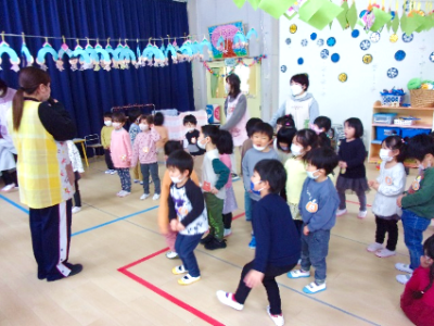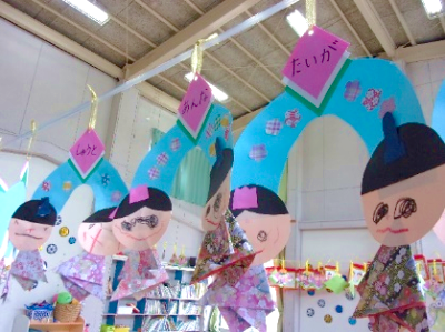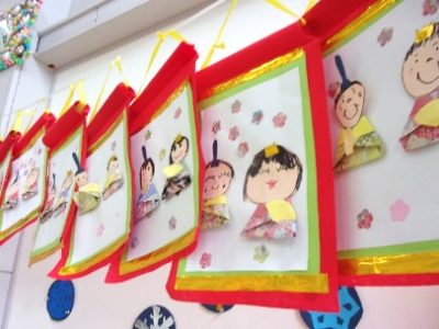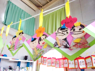 遊戯室には、全園児の作品がずらり。可愛らしいひな人形たちに囲まれて、3月生まれの誕生会がスタートしました。