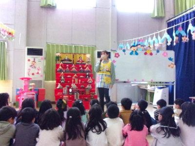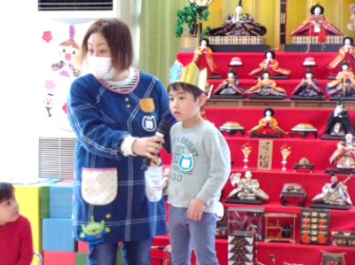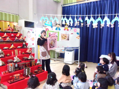 誕生会後は、ひな祭りの由来などの話を聞き、ひなまつりクイズに挑戦!