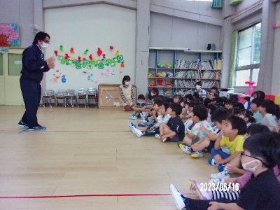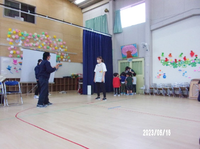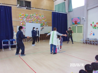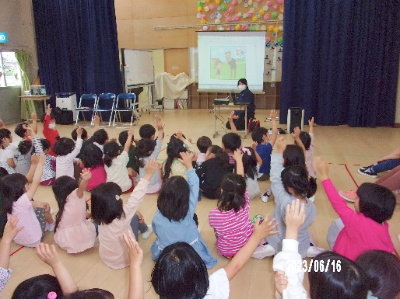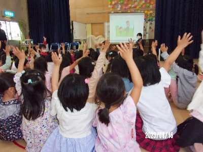 次に、実際に不審者が侵入したと想定して、職員の声掛けで園児を避難させる訓練をしました。