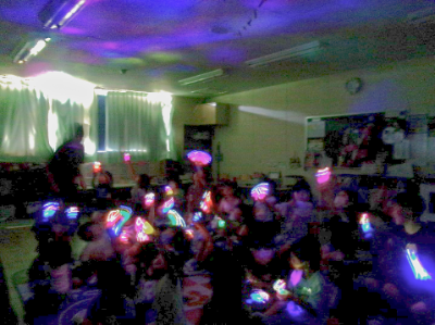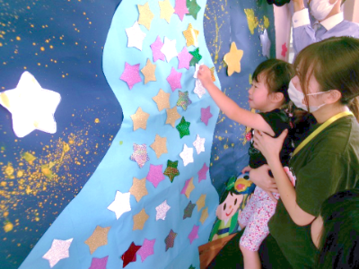 今年のテーマは「星」。ゲームコーナーをすべてクリアして「星」をゲット!その星を貼って、100枚の星が輝く大きな壁面製作「天の川」を完成させました。また、カラーセロファンを使ってプラネタリウムライトを作り、暗い部屋で一斉に点灯させると???天井にカラフルな光が映り「キレイ!!」と歓声があがりました。夜寝るときにもプラネタリウムライト、楽しんでくれたかな?最後に星のおやつを食べてお祭り終了!