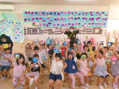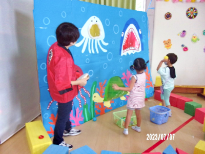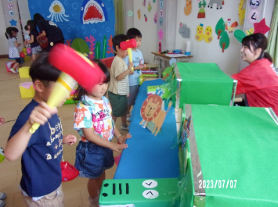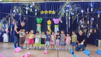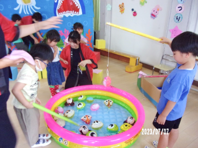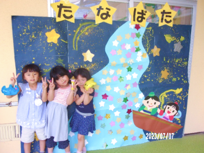 7月7日は「七夕まつり」でした。年長さんは年少さんのお世話にも挑戦。仲良く手を繋ぎ、ゲーム?壁面製作?プラネタリウムシアターの3つのコーナーを巡りました。