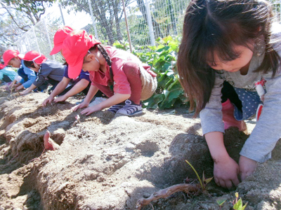 手掘りで土の感触を楽しみながら一生懸命掘り進め、大きくて立派なお芋と小さくてかわいいお芋が掘れました。
