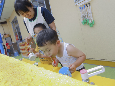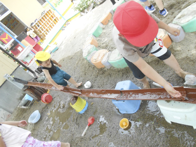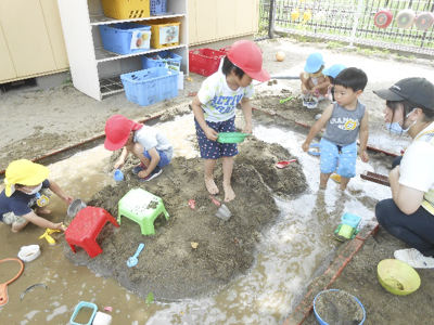 今日もとっても暑かったので、お砂場遊びがいつの間にかどろんこ遊びに発展。