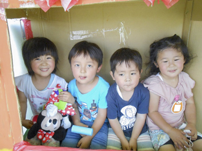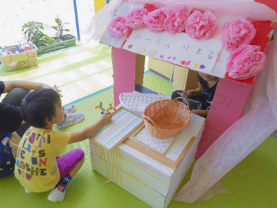 先日、幼稚園では全クラスの机と椅子を新調しました。大量に出た段ボールの空き箱を利用して、お店屋さんごっこや巨大迷路を作って楽しみました。