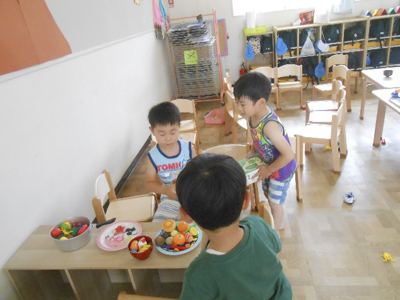 クーラーの効いた室内で涼みながらおままごと男子やものつくりを楽しむ子もいました。