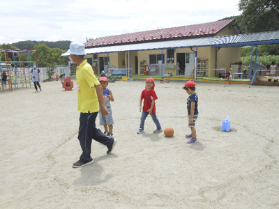 年長さんはルールのあるボールゲームをしました。先生も本気で挑みます。
